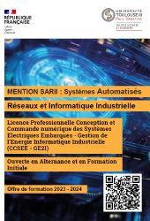 Plaquette - Licence professionnelle parcours Conception et commande numérique des systèmes électriques embarqués - gestion de l'énergie informatique industrielle (CCSEE_GE2I)